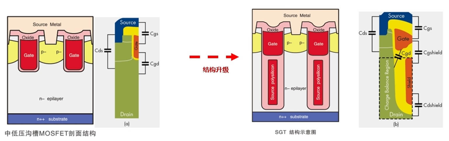 通過在柵極溝槽底部,引入屏蔽柵多晶硅場板,將絕大部分的Cgd轉化為了小值的Cgs,顯著地降低了米勒電容Cgd,加快了開關速度。