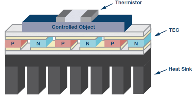 TEC利用半導(dǎo)體材料的珀?duì)柼≒eltier)效應(yīng)制成。所謂珀?duì)柼?yīng),是指當(dāng)直流電流通過兩種半導(dǎo)體材料組成的電偶時(shí),一端吸熱、一端放熱的現(xiàn)象。TEC采用重?fù)诫s的 N 型和 P 型導(dǎo)體材料,多對PN結(jié)通過電極連在一起,并且夾在兩個陶瓷電極之間,并行發(fā)熱或制冷。
