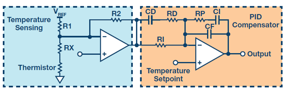 模擬熱反饋環(huán)路包括兩級,由兩個放大器構(gòu)成。第一個放大器接受熱敏電阻反饋電壓(VFB),將該輸入轉(zhuǎn)換為線性電壓輸出。此電壓代表對象溫度,饋入補(bǔ)償放大器中,與溫度設(shè)定電壓進(jìn)行比較,產(chǎn)生一個與二者之差成比例的誤差電壓。第二個放大器通常用來構(gòu)建PID補(bǔ)償器。