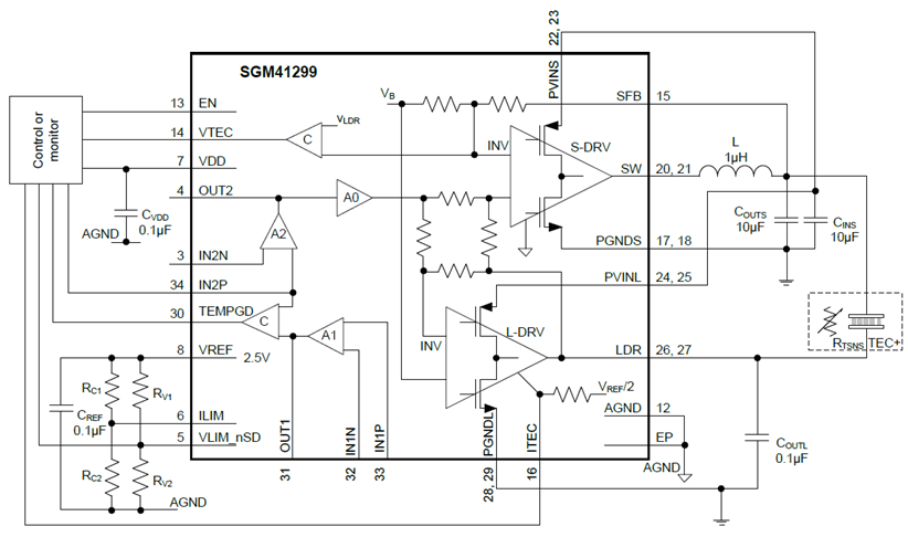 SGM41299主要包括溫度檢測電路、誤差放大器和補(bǔ)償器、TEC電壓/電流檢測和限值電路、差分電壓驅(qū)動器。PWM在H橋配置下控制內(nèi)部功率MOSFET,通過測量熱敏電阻反饋電壓,并使用集成運(yùn)算放大器作為比例-積分-微分(PID)補(bǔ)償器來調(diào)理信號,將模塊溫度建立至可編程的目標(biāo)溫度。