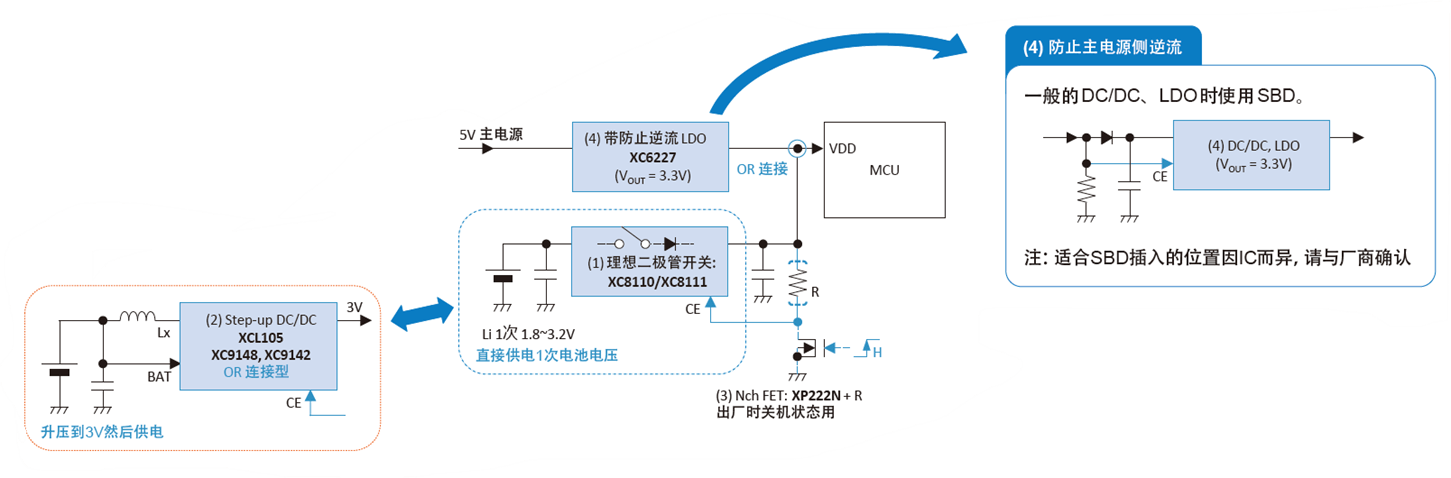 備用電池的連接方法通過使用理想二極管負(fù)載開關(guān)進(jìn)行OR連接,與肖特基二極管SBD相比,大幅度降低VF損失及漏電流