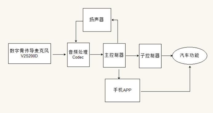 該車外語音識別系統(tǒng)應用主要創(chuàng)新點在替代傳統(tǒng) MEMS MIC,使用頻寬寬、功耗低的專用骨傳導麥克風來拾音。該方案實現(xiàn)了車外語音的整車喚醒、回聲消除、引擎聲降噪、快速交互、語音播放裝置播報及自然語義理解。該方案是為了讓用戶可以不依賴于傳統(tǒng)鑰匙也無需打開車門進入車內(nèi),在其靠近車輛時,便可以使用語音在車外喚醒車輛并交互。