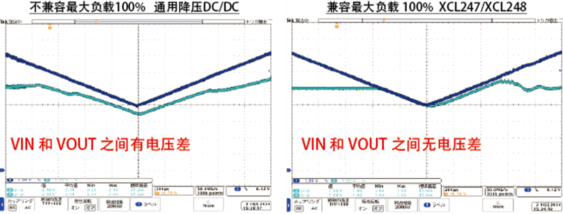 XCL247/XCL248系列采用的是P溝道驅(qū)動(dòng)FET,替代高壓DC/DC轉(zhuǎn)換器中常用的N溝道驅(qū)動(dòng)FET,實(shí)現(xiàn)了100%占空比對(duì)應(yīng)。即使在輸入電壓低于輸出電壓設(shè)定值時(shí),仍可直接導(dǎo)通輸入電壓進(jìn)行輸出。這使得在輸入輸出電壓差較小的工況下也能安心使用(圖4)。此外,通過(guò)搭載提示輸出電壓穩(wěn)定狀態(tài)的PowerGood功能與啟動(dòng)時(shí)軟啟動(dòng)功能,可滿足工業(yè)設(shè)備對(duì)后級(jí)負(fù)載系統(tǒng)電源時(shí)序控制的高要求。